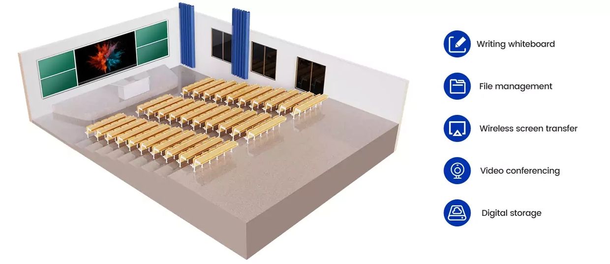 Built-in interactive whiteboard designed with file management, wireless screen transfer, video conferencing and other functions. With intelligent systems, this interactive display for education can be controlled by mature, self-developed applications and software.